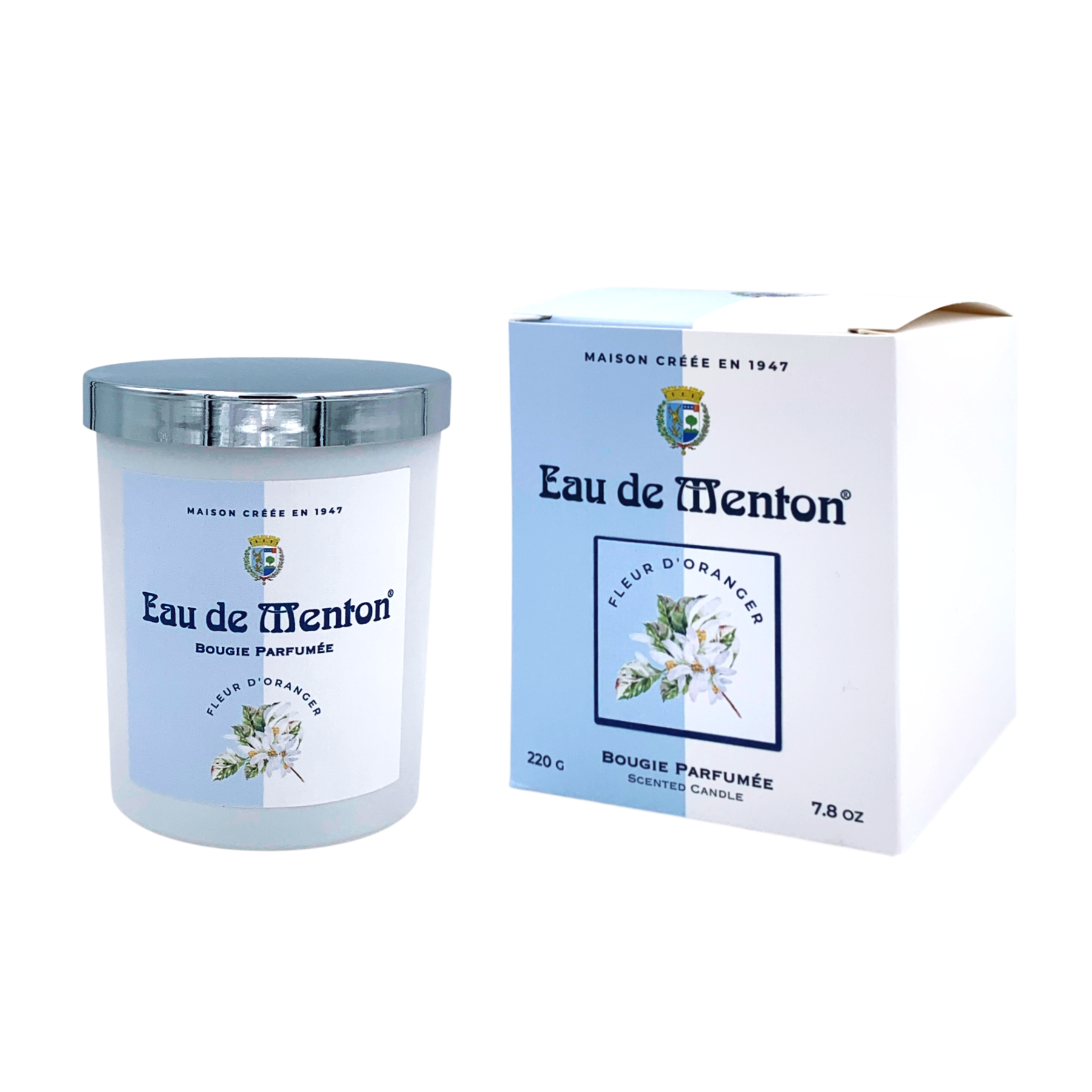Bougie 220gr présentée dans un verre blanc, avec boîte cartonnée et couvercle en métal.