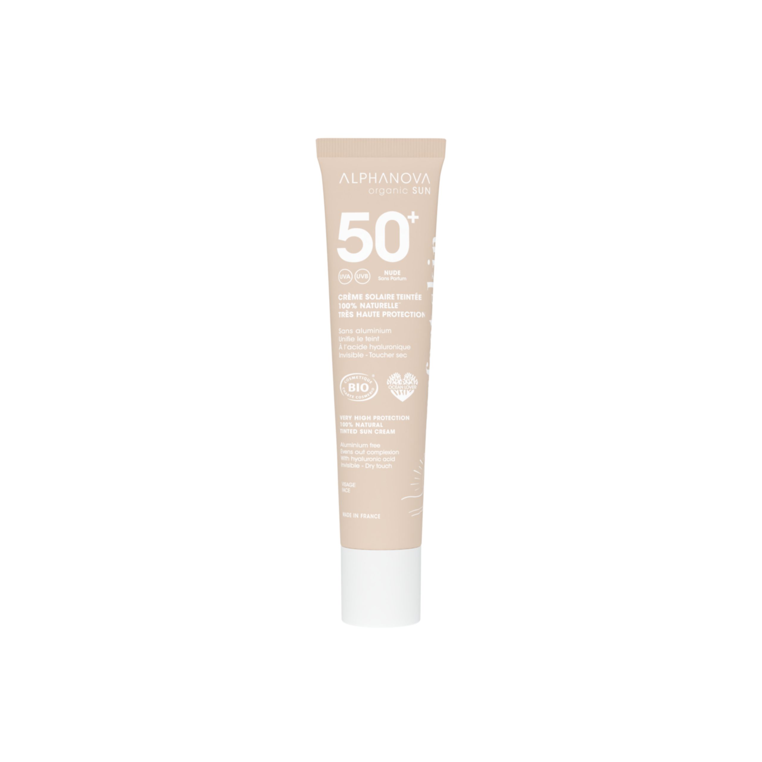 Cette crème solaire teintée nude SPF 50+ est une protection visage 100% naturelle** et sans parfum. Sa texture invisible au toucher sec est enrichie en acide hyaluronique.